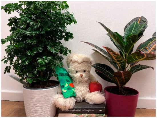 Green is Healthy (#34). Caption: “Green is Healthy”: plants, fruits, vegetables are beneficial to health. You need to get out of the city and into green areas as often as possible, because it also calms you down. The teddy bear in the photo is a symbol of animals, but also people and living beings. The teddy bear sits on books talking about respecting nature (Source: Master’s Nursing Student, Photo 34, Group 2).