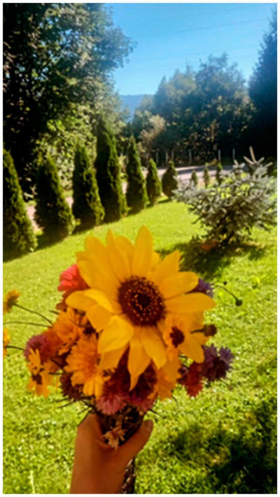 This photo is reminiscent of other study photos with a similar content. Many study photos showed outside activities that participants considered as contributing to health: hiking, biking, walking the dog, and spending time outdoors. Besides the documentary aspect of walking in a park, the photographer explains in the captain that the sunflower is a symbol of happiness and health, thus referring to mental health. The phrase “this view completely illustrates peace” indicates the need for perception and critical thinking skills among the group of students participating in the study. As with Figure 1, the student appears to ascribe to the concept that behavioural change is possible.