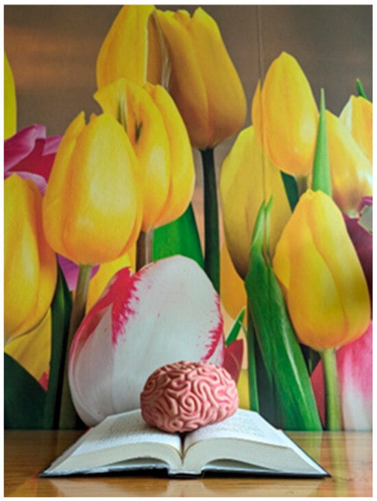 The second photo (see Figure 3) in the series shows a model of the brain lying on a book, which represents knowledge and education. The brain and book are in a friendly environment: in front of a wallpaper showing bright yellow, white, and red tulips in bloom. In the caption, the photographer refers to the pleasant surroundings as a health protective factor. A second health protective factor shown is reading for education and relaxation, represented by the book upon which the brain is resting.