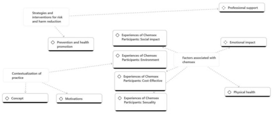 These findings illustrate the complexity of the intervention, highlighting the importance of effective strategies and the consideration of various alternatives to address simulated mental health situations. Figure 1 allows us to establish the following themes: 1. Contextualization of the practice (Concept, Environment, Motivations). The second theme deals with the factors associated with chemsex (Physical health, Sexuality, Social impact, Economic impact, Emotional impact). The third theme deals with risk and harm reduction strategies and interventions (Seeking professional support, Prevention and health promotion). All of them are interrelated with each other and with the chemsex phenomenon through the ATLAS-Ti program.