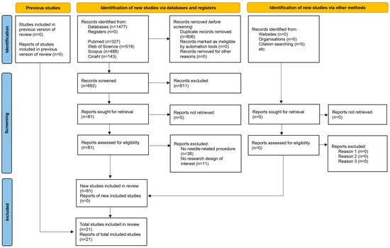 In the initial literature search, 1477 articles were identified. No additional documents were excluded from specific clinical trial registries such as ClinicalTrials.gov and PROSPERO. After removing 806 duplicate manuscripts using the Zotero® reference manager (version 7.0 (George Mason University, Fairfax, VA, USA)) and applying the inclusion criteria to assess titles and abstracts, 611 articles were excluded due to their not meeting the established criteria. Ultimately, 21 studies were selected for the systematic review, of which 18 provided data for the meta-analysis, encompassing a total sample of 2663 participants, who were subjected to a distraction intervention with VR (n = 1145 in the VR experimental group vs. n = 1095 in the standard care control group), plus 423 participants who underwent other distraction techniques such as the cold vibration method or the use of playground equipment.