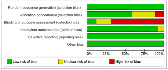 The risk of bias in the included clinical trials was independently assessed in duplicate by two researchers (M.C.-G. and E.M.) using the Cochrane Risk of Bias tool (version 2.0 (Cochrane, London, UK)) [24]. The studies were evaluated across six domains: randomization and sequence generation, allocation concealment, blinding of outcome assessment, completeness of outcome data, selective outcome reporting, and ethical concerns. Additionally, factors such as conflicts of interest with commercial entities and small sample sizes were considered. Due to the nature of the intervention, RCTs that could not implement the blinding of personnel and participants were not penalized, as this is often infeasible with many instruments.