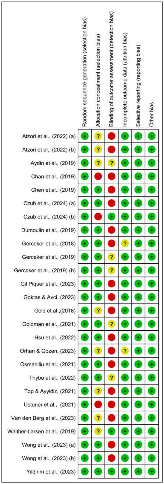 Risk of bias summary: review authors’ judgments about each risk of bias item for each included study. Red = high risk; green = low risk; yellow/? = unclear risk; +/− = risk percentage.