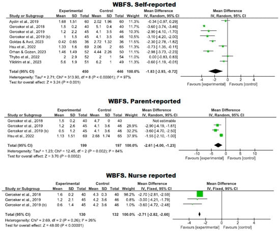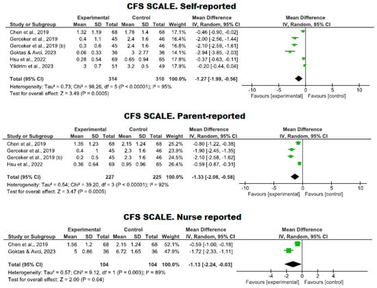 A lower level of pain was observed in the VR group compared to the control group, as reported by the patients themselves (p = 0.001; MD = −1.83; with a 95% CI −2.93 to −0.72), by the parents (p = 0.0002; MD = −2.61; with a 95% CI −4.00 to −1.23), and by the nursing staff (p = 0.0001; MD = −2.71; with a 95% CI −2.82 to −2.60). However, high heterogeneity was observed in the first two reports (patients and parents) (I2 = 97% and 84%, respectively). The fixed-effect model was used only for nurse-reported pain.