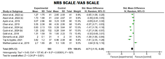 A lower level of pain was observed in the VR group compared to the control group (p = 0.001, MD = −0.71; with a 95% CI −1.13 to −0.28). However, high heterogeneity was noted (I2 = 92%).