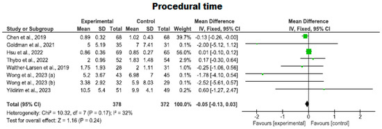 A slight trend toward longer procedure times was observed in the VR group compared to the control group; however, the findings were inconclusive as the results approached the line of no effect (p = 0.24, MD = −0.05; with a 95% CI −0.13 to 0.03). Low heterogeneity was observed (I2 = 32%). Therefore, the fixed-effect model was used.