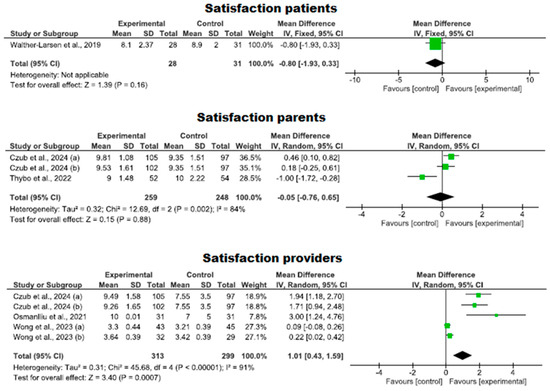 A higher level of satisfaction was observed in the VR group compared to the control group with respect to providers (p = 0.0007 MD = 1.01; 95% CI 0.43 to 1.59). No such findings were found when patients and parents were asked (p = 0.88 MD = −0.05; 95% CI −0.76 to 0.65). Specifically, in the patient group, only a single study could be evaluated, making comparisons and, thus, results impossible. Heterogeneity was high (I2 = 84% and 91%).
