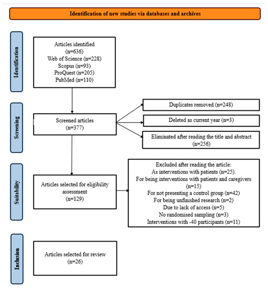 The exclusion criteria that were established were as follows: (a) theses, dissertations, letters, and conference abstracts; (b) articles based on other research, narrative or literature reviews, meta-analysis articles, and proposals for intervention projects; (c) research studies that have not been concluded; (d) research studies that do not focus on caregiver burden and assess other non-relevant aspects for the review; (f) scientific articles published in any language other than Spanish or English; (g) interventions conducted solely with patients or with patients and caregivers together; and (h) interventions developed with fewer than 40 participants. The accuracy of study results largely depends on the sample size [13]. Studies with small sample sizes tend to have greater random variability and, therefore, lower precision in estimating effects. Additionally, studies with few participants have limited statistical power, making it difficult to detect real differences between the groups studied [14]. In a meta-analysis, this can be partially mitigated by weighting the effect sizes of studies by the inverse of their variance, but since this is not possible in a review, it was decided not to include studies with small sample sizes to avoid drawing erroneous conclusions.