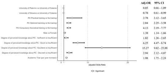 As shown in Figure 1, multinomial ordinal regression revealed that practical PC training substantially enhanced competencies (Adj-OR 2.78 [95% CI = 2.12–3.65]). Male students had higher competence odds (Adj-OR 1.38 [95% CI = 1.14–1.66]), and perceived knowledge strongly correlated with self-assessed competence. Advancement in academic years also positively influenced competence self-assessment (Adj-OR 1.98 [95% CI = 1.75–2.24]).
