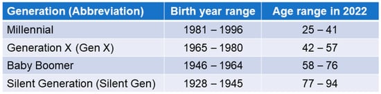 Generation was defined by post hoc categorization of participants’ self-reported age in 2022 into the following categories [22]: Silent Generation (age ≥ 77 at the time of data collection, i.e., born 1928–1945; n = 46), Baby Boomers (age 58–76, born 1946–1964; n = 277), Gen X (age 42–57, born 1965–1980; n = 149), and Millennials (age ≤ 41, born 1981–1996; n = 66). Seven participants aged 18–25, who are considered part of Generation Z, were included with Millennials (total n = 73). See Figure 1.