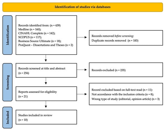 We identified a total of 439 studies across five databases, and 256 studies remained after removing duplicates. After screening the titles and abstracts, 235 studies were excluded. The full text of 21 studies was then read and assessed for compliance with the predefined eligibility criteria. Upon completing all phases of analysis and evaluation, 10 studies were included in this review. The results of the search conducted, as well as the reasons for study exclusion, are presented in the PRISMA flow diagram (Figure 1) [22].