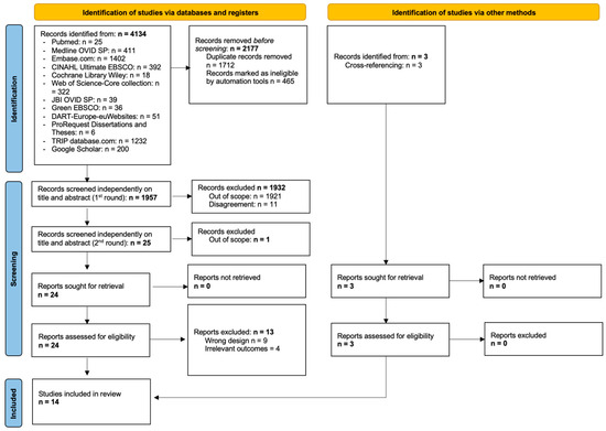 Our literature search retrieved a total of 4137 references. During the two rounds of our screening phase, the two researchers excluded 4123 studies. A total of 27 studies were assessed for eligibility, of which 6 were excluded. A total of 14 studies were included in this systematic review (Figure 1).
