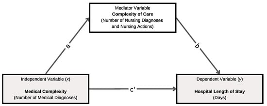 More broadly, the theoretical justification of this framework, which is based on a literature analysis, supports the notion that the independent variable and mediators may have an impact on the dependent variable []. In particular, the medical complexity of patients, measured using the number of medical diagnoses [], may have an impact on the patient complexity of care, as expressed by NDI and number of NAs [,,]. According to our hypothesis, more numerous medical conditions may result in the identification of a major number of NDs and the need for more NAs [,], and this may have a direct effect on LOS [], generating pLOS.