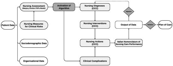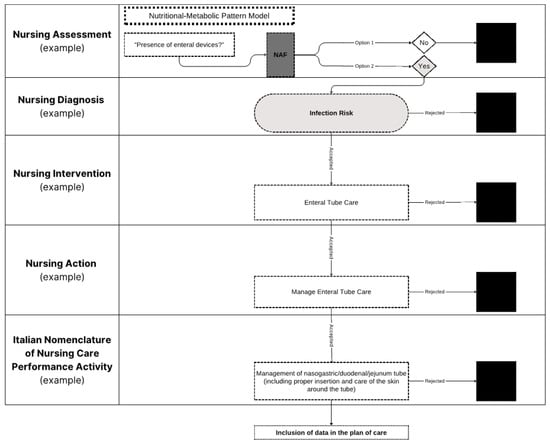 An example of how the PAIped algorithm (called the Nursing Assessment Form—NAF) [] operates, generating NDs, NIs, NAs, and INNCP components that must be validated by nurses, is illustrated in Figure 3.