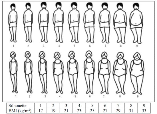 According to the International Society for the Advancement of Kinanthropometry (ISAK) statements [17], an anthropometric assessment was performed on each participant by a level 2 anthropometrist certified by the ISAK. Anthropometric data were measured using a portable height rod and an impedance scale, model BC-601 (Tokyo, Japan), both from the TANITA brand. Demographic data were collected through a questionnaire. Self-perceived BMI was obtained by employing the scale proposed by Stunkard and Stellar [11] (Figure 1), later modified by Collins [18], which includes nine drawings of female and male figures. Each drawing represents different body mass index (BMI) values, from 17 kg/m2 to 33 kg/m2, in two-unit increments.