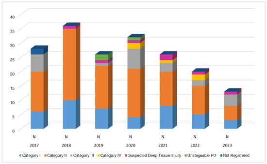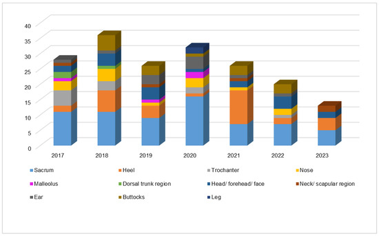 It is important to note that the anatomical site of PU development is not independent of the year of occurrence. The statistical analysis showed a significant relationship between the year and PU location (χ2(60) = 83.172; p = 0.026), indicating that evolving care practices and patient characteristics influenced PU distribution.