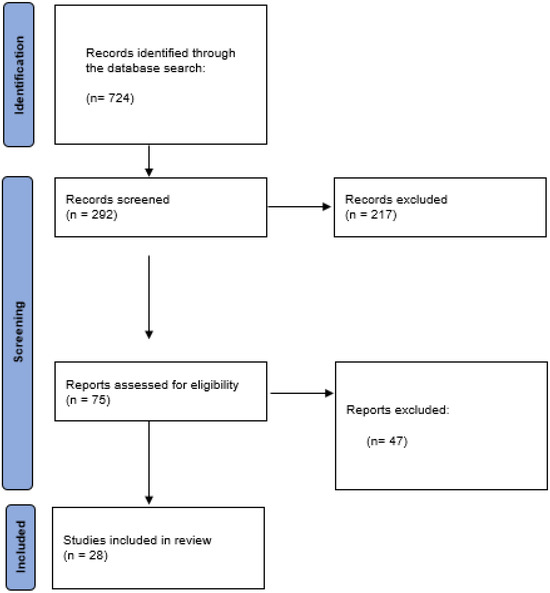 After the initial search of the aforementioned databases, 724 articles were located. After applying the inclusion and exclusion criteria, the number was reduced to 292 articles. Subsequently, a total of 217 articles were excluded, after reading the title and abstract, leaving 75 works. Finally, after a complete reading and elimination of duplicates, 28 results were obtained for this review.