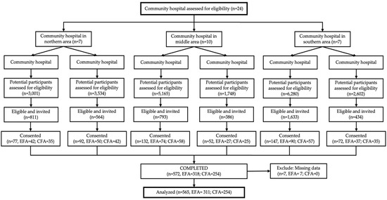A total of 22,330 medical records were screened and 4621 older adults were identified that met the study inclusion criteria (i.e., 20.60% were found eligible). The research assistant invited all of those eligible to join the study based on the sampling strategy (see Figure 1). Finally, 572 of the 4621 invited older adults completed the survey, demonstrating a response rate of 12.38%. Of these responses, 7 were incomplete due to some missing responses and were therefore not analyzed, resulting in 565 completed surveys being included in the analyses.
