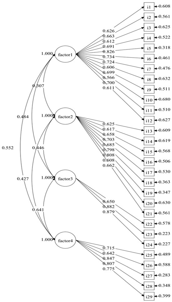 During the confirmatory factor analysis (CFA) of the DP-IFSM-PQ, the goodness of the proposed 4-factor model was evaluated using a range of fit indices, including the χ2/df ratio, root mean square error of approximation (RMSEA), comparative fit index (CFI), and Tucker–Lewis’s index (TLI). The results from the CFA indicated an acceptable fit of the measurement model to the data (χ2/df = 2.094, RMSEA = 0.066, CFI = 0.868, TLI = 0.855). Figure 2 illustrates that most factor loadings were above 0.600 (ranging from 0.608 to 0.882), except for item 10 in factor 1, which had a loading lower than the recommended value (λ = 0.566). In addition, the composite reliability (CR) for each factor, which exceeded the acceptable level of 0.60 (ranging from 0.850 to 0.942), indicated the presence of convergent validity. Additionally, the average variance extracted (AVE), noted in Table 4, was computed to assess the discriminant validity of this proposed 4-factor model. The AVE of factor 3 (0.658) and factor 4 (0.578) exceeded 0.500, while those of factors 1 and 2 were slightly below the recommended threshold. Similarly, the AVE of factor 1 was slightly smaller than some correlation coefficients between each of those factors and another factor, demonstrating limited discriminant validity.