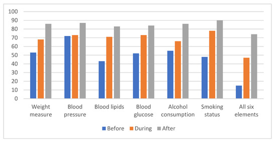 SMI Physical health checks: Comparison of percentage measurement of six core elements, before, during and after project.