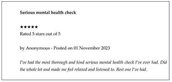 We were unable to find out the experience of people with SMI who attended a health check and subsequent follow up, as it was perceived that asking the GP practice staff to assist two of their patients with SMI to complete a paper questionnaire following a health check would be too burdensome. Instead, practice staff were asked to send patients a link to an online questionnaire, despite our advice that this would not yield a good response. We do not know how many practices sent out the link. There was no response at all. The only opinion we received from a patient with SMI was an example of online feedback to one GP practice (Figure 4).