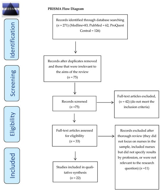 The initial exploration yielded 174 articles regarding conflict management styles and strategies in a nursing context. After eliminating duplications, 75 articles underwent advanced screening. Of these articles, 42 studies were excluded as they did not pertain to the actual topic investigated. Subsequently, an additional 20 articles failed to meet the inclusion criteria. Consequently, only 22 articles ultimately met the stringent inclusion criteria developed in the current study. The PRISMA flow diagram shows in a detailed way the steps followed until the final selection of studies (Figure 1).
