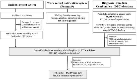 Additionally, wards established for a limited period, incidents unrelated to medication, incidents not involving nurses, and ward data with outlier nursing time per patient during day or night shifts were excluded. Data without ward codes or dates entered in the DPC data, Form 9, or the incident reporting system were treated as missing values.