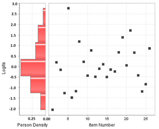 Regarding model fit, all 26 items showed central values of Infit and Outfit at 1, confirming the unidimensionality of the construct. The mean Infit was 0.98 (0.85 to 1.23), standardized Infit −0.41 (−3.01 to 4.13), Outfit 0.97 (0.71 to 1.23), and standardized Outfit −0.37 (−2.95 to 2.79). The difficulty values ranged from −2.08 for item 1 (The pediatric population is more susceptible to environmental threats due to their biological immaturity), the easiest item, to 2.78 for item 5 (Nitrogen oxide from fossil fuels in the home and tobacco smoke causes redness and burns on the skin), the most difficult. The item separation index was 7.05, and the person separation index was 1.75. Item separation was robust, but person separation showed some restrictions. The reliability for the item set was 0.98, and for the person 0.75 based on Rash’s model. Again, these values reflect strong item quality but some restrictions in the range of persons in the sample, although both reliability values exceed the established limits. The individual item fit values can be examined in Table 3. To appreciate the performance of the items, they are plotted in Figure 2. In this figure, it can be seen that most of the items are concentrated at intermediate levels of ability, with some items being easier and some more difficult to measure adequately for the higher and lower-ability students in the sample. This could indicate a well-balanced measurement instrument with an appropriate mix of items at different levels of difficulty, allowing one to distinguish between participants of different levels of knowledge.