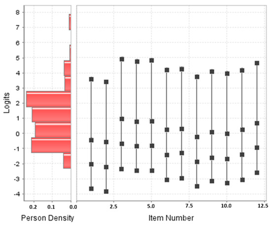 The score limits on the Likert scale range from −3.05 to 4.21, increasing in value progressively along the scale, with no setbacks, as shown in Table 7. In addition, the values of Infit and Outfit are in line with the established values, with only the outfit of item 2 showing an under-adjustment.