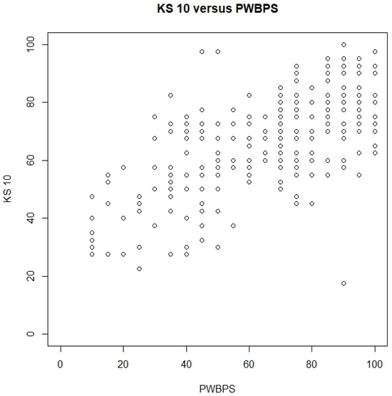 A total of 297 children ages 8–11 participated in this part of the present study. See Table 1 for demographic information. A total of 237 children completed all the items of both the KS 10, with scores ranging from 10 to 50, and the PWBPS©, with scores ranging from 10 to 30. The Spearman’s correlation was estimated to be 0.64 (95% CI [0.55, 0.71], indicating that as the KS 10 scores become higher, the PWBPS© also tends to score higher. Furthermore, when converting to 0–100 scores, the two tools’ centers are similar, but with PWBPS© having more variation (see Figure 2). Figure 3 demonstrates these similarities and Table 3 shows the scores by quartile for each instrument. For the KS 10 T-values, the sample mean and median were around 45. For both tools, there were noted age and gender effects. While the KS 10 does not seem to vary by age, the PWBPS© scores tend to decrease as the age increases. See Figure 4 for box plots that demonstrate the scores by age. Additionally, females tended to score lower compared to males. See Figure 5 for box plots that demonstrate the gender differences. Based on the ruler of the response from the KS 10 manual, with a cutoff for the KS 10 T-value = 30 (or 22 in the original score or 30 in the 0–100 score) as a reference, the area (AUC) under the receiver operating characteristic (ROC) curve of the PWBPS© was estimated to be 0.86 (95% confidence interval [0.73, 0.99]), with an estimated cutoff of 18.5 in the original score (or 42.5 in the 0–100 score) for the PWBPS©. Using the summary question from the KS 10, the AUCs using the PWBPS© and KS 10 in predicting a “poor” response were estimated to be 0.91 and 0.90, respectively (Figure 6). Based on the ROC analysis, the cutoff score where a referral is recommended to be initiated to further assess the child was estimated to be 15.5 in the original score (or 27.5 in 0–100 score) for the PWBPS© and a cutoff value of 28.5 in the original score (or 46.25 in the 0–100 score) for the KS 10.
