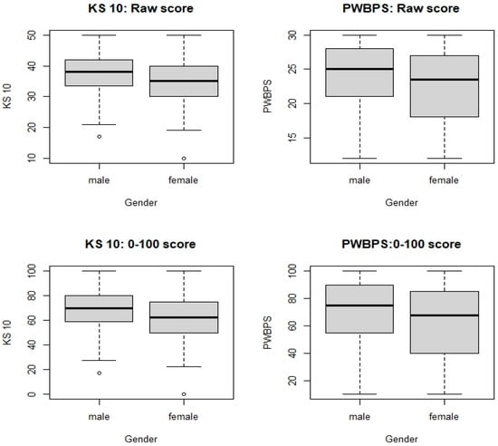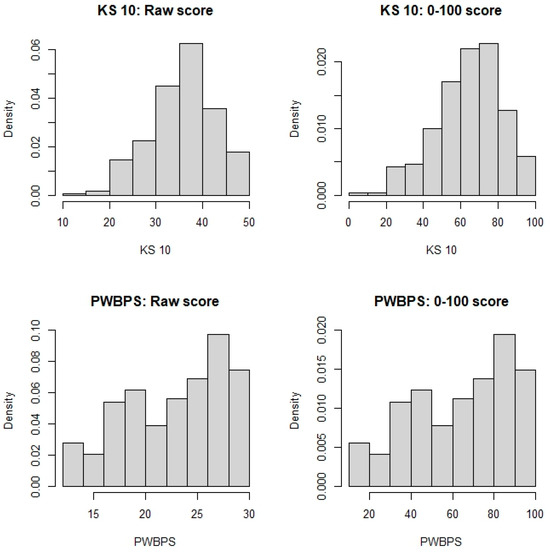 Summary of the raw and 0–100 scores for the KS 10 and PWBPS© by quartile.