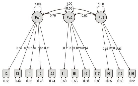 The factor extraction method used was PAF (principal axis factoring—common factor analysis), and the rotations used for optimal loading extraction were oblique (promax, oblimin, quartimin, simplimax, bentlerQ, geominQ). Items 7 and 14 were excluded from the questionnaire as their factor loadings were below the 0.40 threshold on all three factors (Table 5 with promax rotation).