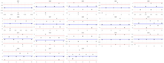Bland–Altman plot for 18 questionnaire items. See Section 2.6 for interpretation methodology.