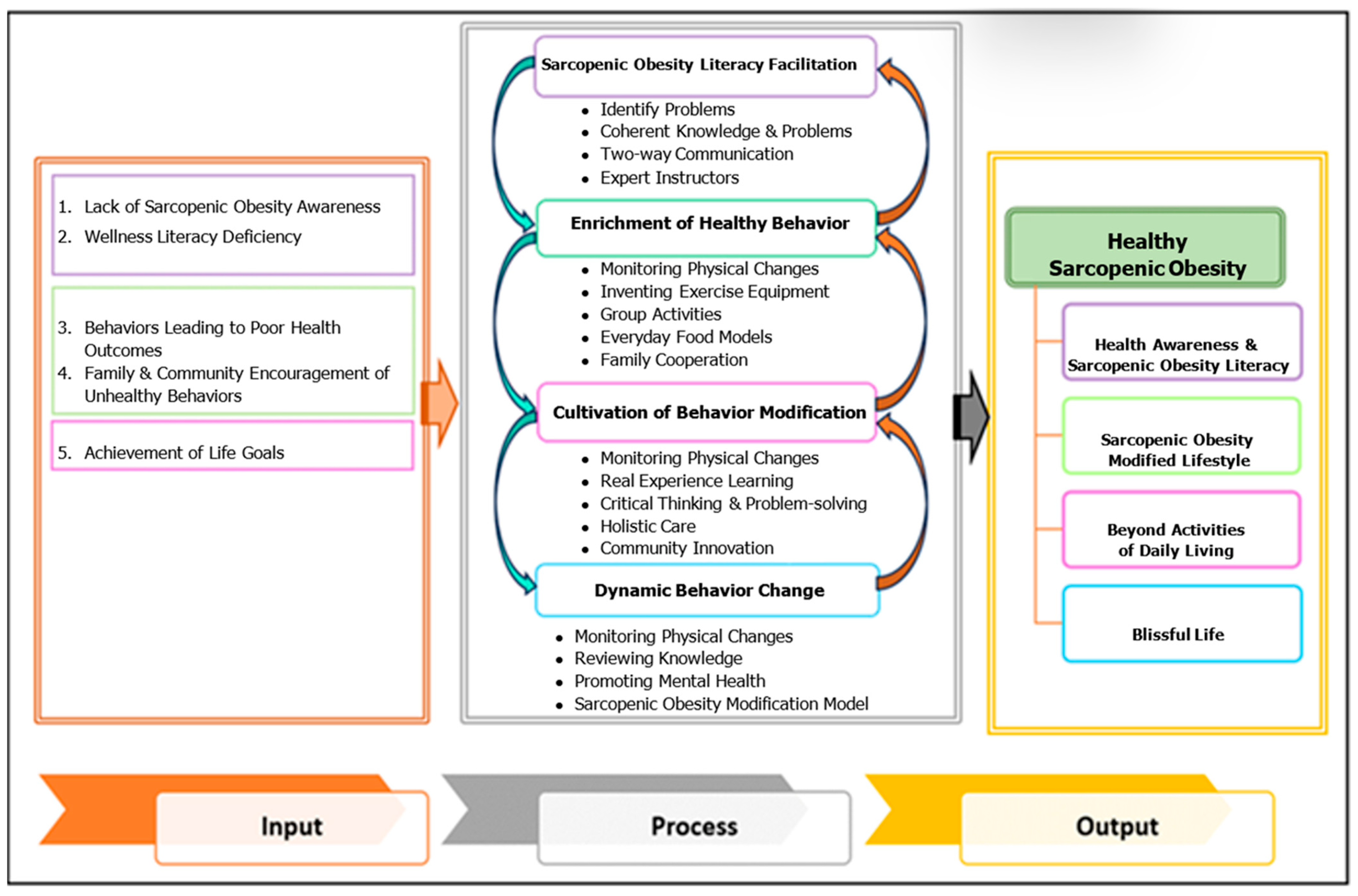 The output of the care model for older adults with SO was “healthy sarcopenic obesity”, which is a condition where, despite having SO, older adults have no physical, emotional, and psychosocial effects from the disease, but remain able to perform activities in daily living. In addition, they are able to live freely in the community with appropriate healthcare behaviors and an accurate personal perception of health. In addition, by gaining literacy about sarcopenic obesity and general health awareness, the participants were empowered to modify their behaviors, effectively manage their condition, prevent complications, and serve as a role model for others.