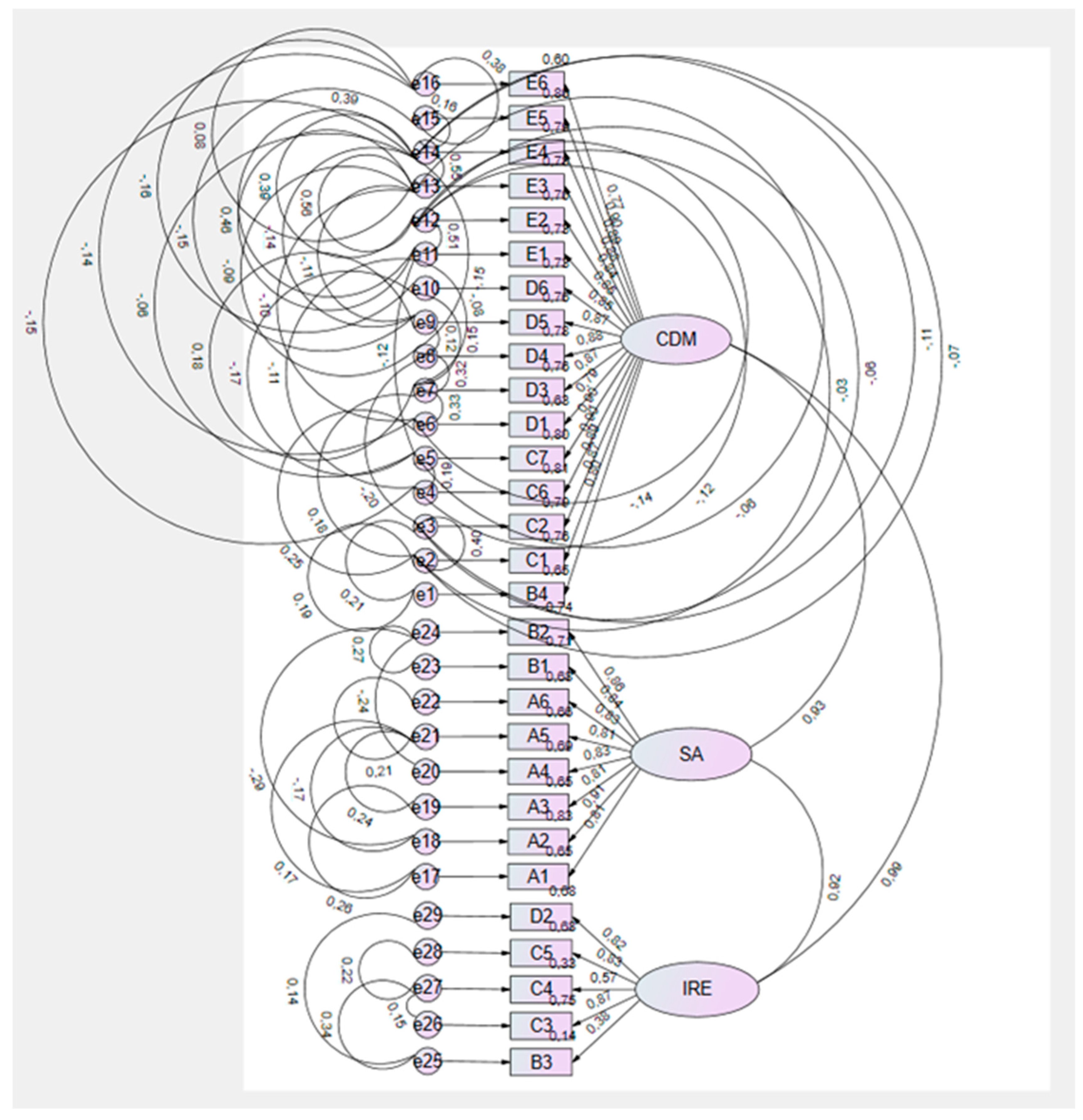 The quality of the overall model fit was analyzed using multiple fit indices. The local fit was assessed based on the modification indices provided by the program, as well as on theoretical assumptions (values > 11; p < 0.001) [36]. A total of 54 covariance corrections were made, which resulted in an improvement in the overall fit indices, with the model achieving a very good fit: PCMIN/DF = 1.689, RMR = 0.024, GFI = 0.855, AGFI = 0.803, Delta2/NNFI = 0.969, CFI = 0.969, RMSEA = 0.058, MECVI = 3.910, and SRMR = 0.0268.