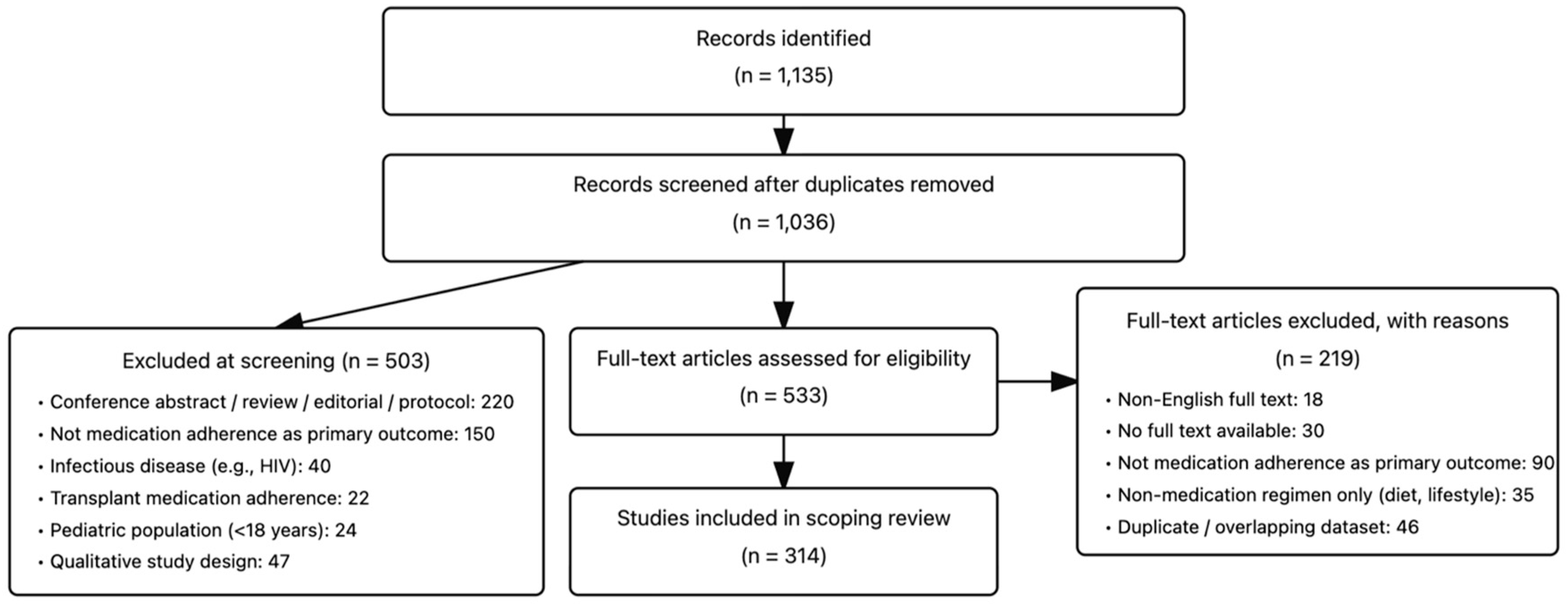- Concept: Medication adherence measurement was the primary outcome, including subjective (self-report questionnaires/visual analog scales) and objective methods (pharmacy refill metrics, electronic monitoring, biologic assays).