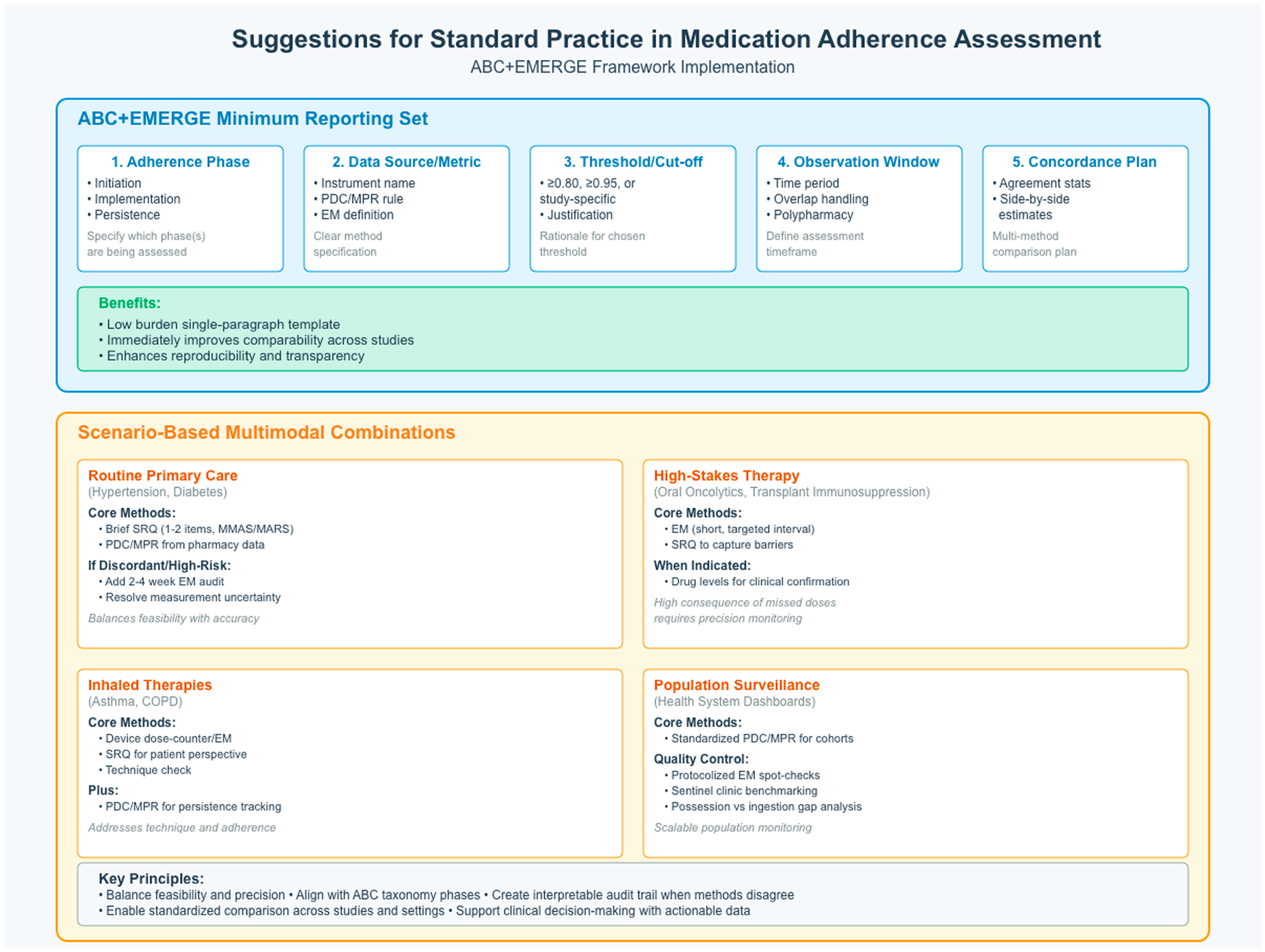 Pharmacy refill records (PDC/MPR) | Compares expected vs. actual remaining doses. | Persistence → Implementation | Scalable/low cost; cannot confirm ingestion; thresholds vary (often ≥ 0.80, sometimes ≥ 0.95). Reporting per EMERGE improves comparability |