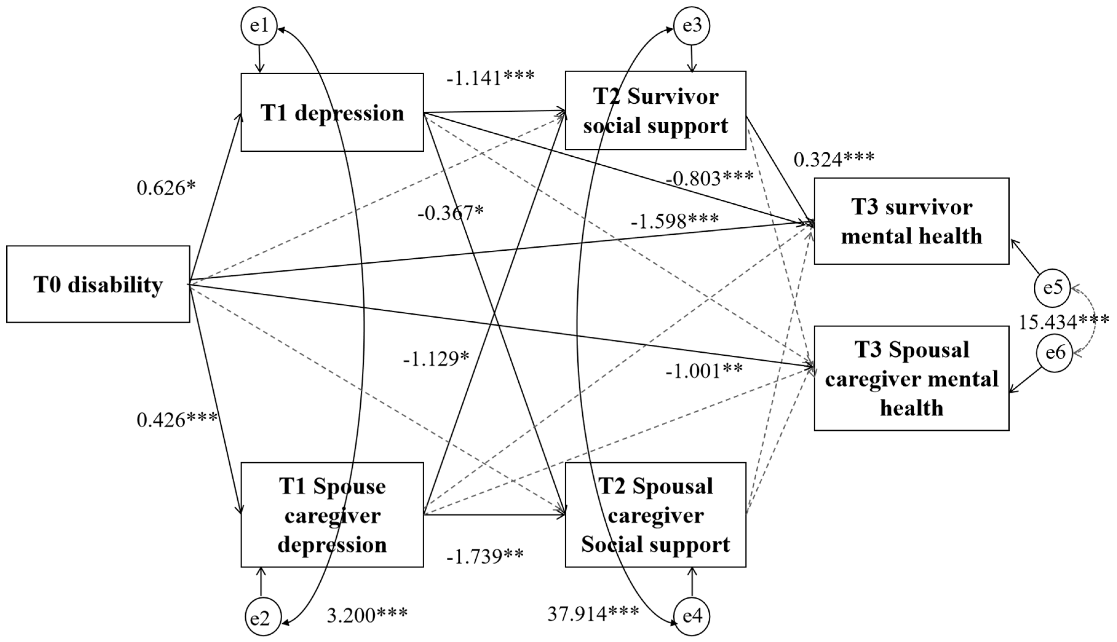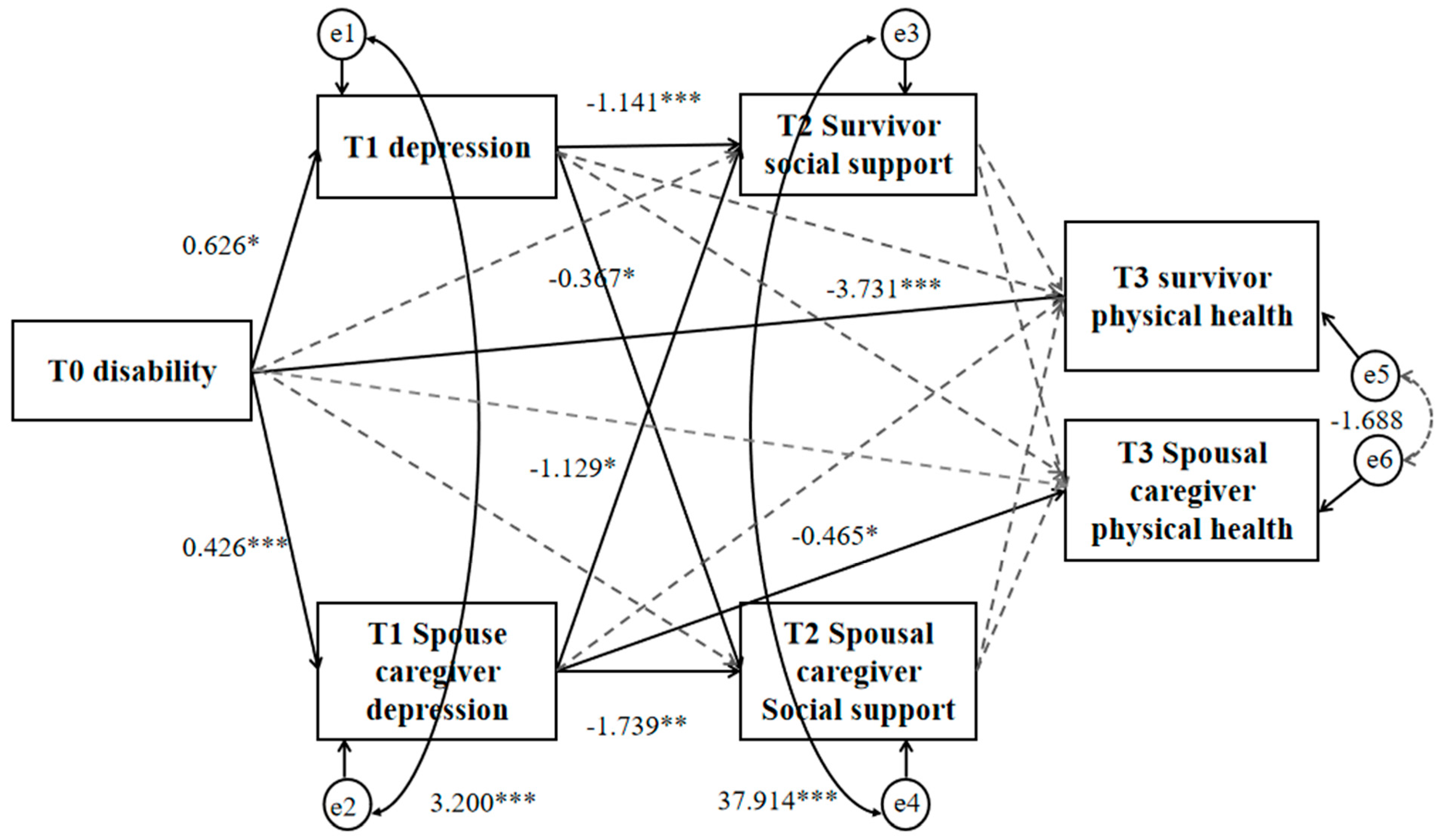 3.3. The Mediating Effect of Dyadic of Physical Health and Disability-Depression-Social Support in Couples of Stroke Survivors