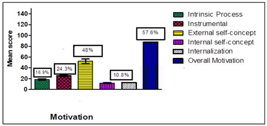 The mean overall motivation score was 57.6% (see Figure 1). Among the motivational dimensions, external self-concept motivation accounted for 48%, instrumental motivation for 24.3%, intrinsic process motivation for 16.9%, and internal self-concept motivation for 10.8%.