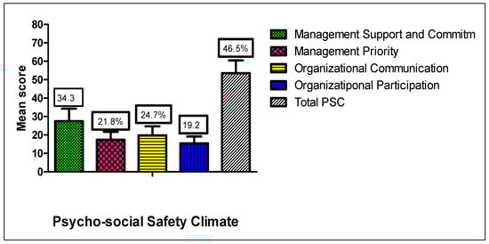 The mean total PSC score was 46.5% (Figure 2). Management support and commitment scored highest (34.3%), followed by organizational communication (24.7%), management priority (21.8%), and organizational participation (19.2%).