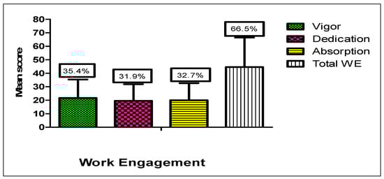 Figure 3, showing work engagement dimensions, likely demonstrates moderate levels of vigor, dedication, and absorption among participants. The mean total WE score was 66.5%. Among its dimensions, vigor scored highest (35.4%), followed by absorption (32.7%) and dedication (31.9%).