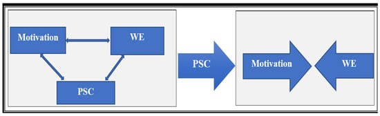A bootstrapped mediation model (5000 resamples) tested whether PSC mediated the relationship between motivation and WE. The direct effect of motivation on WE was small and not statistically significant (B = 0.05, p = 0.09). The indirect effect through PSC was statistically significant but small (B = 0.07, 95% CI [0.02, 0.14], p = 0.02), indicating partial mediation. The total effect of motivation on WE was significant but modest (B = 0.12, p = 0.004) (Table 4, Figure 4).