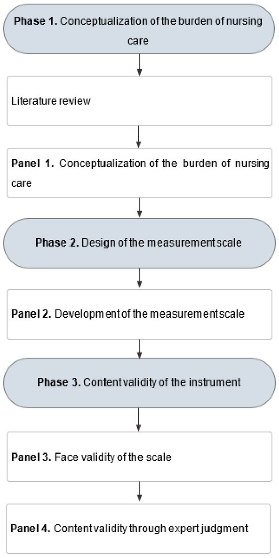 This was a methodological study aimed at designing and validating the content, through expert judgment, of an instrument to measure the burden of nursing care, based on the framework proposed by Waltz [37]. The process was carried out in three stages, as illustrated in Figure 1.