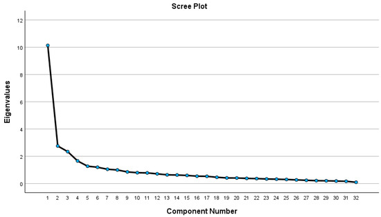 For the factor analysis, the varimax orthogonal rotation method was used, and six factors were retained as basis of the Kaiser criterion (eigenvalues greater than 1). To ensure the quality of the factor solution, only items with factor loadings equal to or greater than 0.40 were considered, as recommended by Hair et al. (2014) and Marôco (2010) [26,27,28]. In this process, items 9, 14, 16, 21, 25, 30, and 31 were excluded because they had factor loadings below the established threshold, indicating low representativeness in the identified structure. Additionally, items 2, 17, and 25 were removed because they were not consistently associated with any of the extracted factors and thus did not contribute to the robustness and consistency of the factor solution (Table 4).