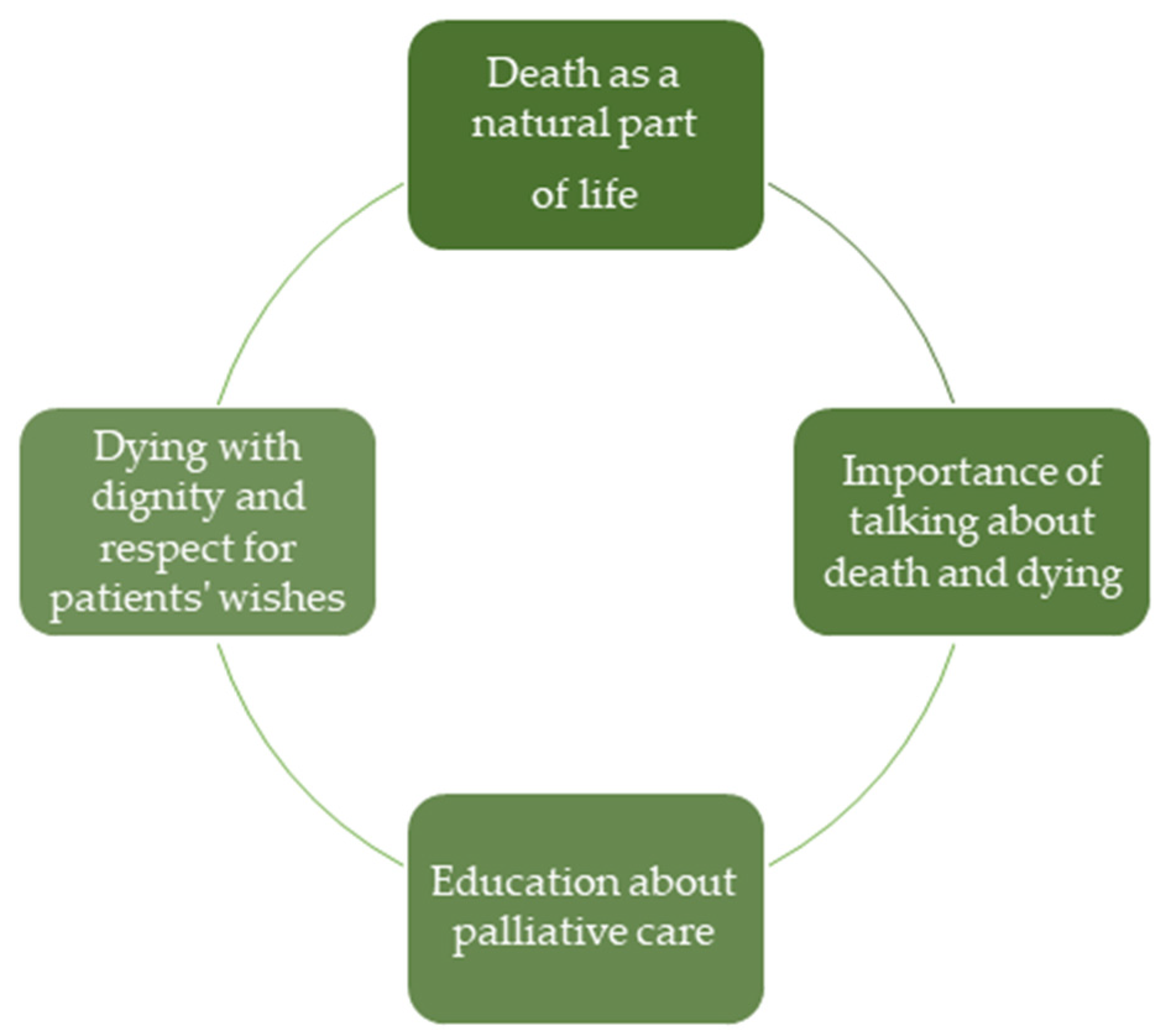 - Castro, A.A.; Taquette, S.R.; Marques, N.I. Cuidados paliativos: Inserção do ensino nas escolas médicas do Brasil. Rev. Bras. Educ. Med. 2021, 45, e056. [Google Scholar] [CrossRef]