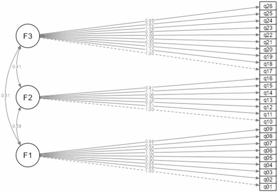 The Cronbach’s alpha coefficient, if the item in question was excluded, remained mostly in the range from 0.948 to 0.953. Subscale reliability estimates were high for F1 (α = 0.952) and F3 (α = 0.903), and acceptable for F2 (α = 0.776), consistent with later AVE/CR results.