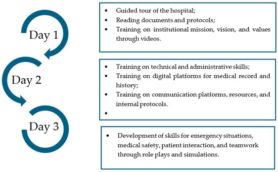 Over three consecutive days, the onboarding program focused on institutional orientation, developing administrative and technical skills according to the institution’s digital platforms, and clinical integration (see Figure 1).