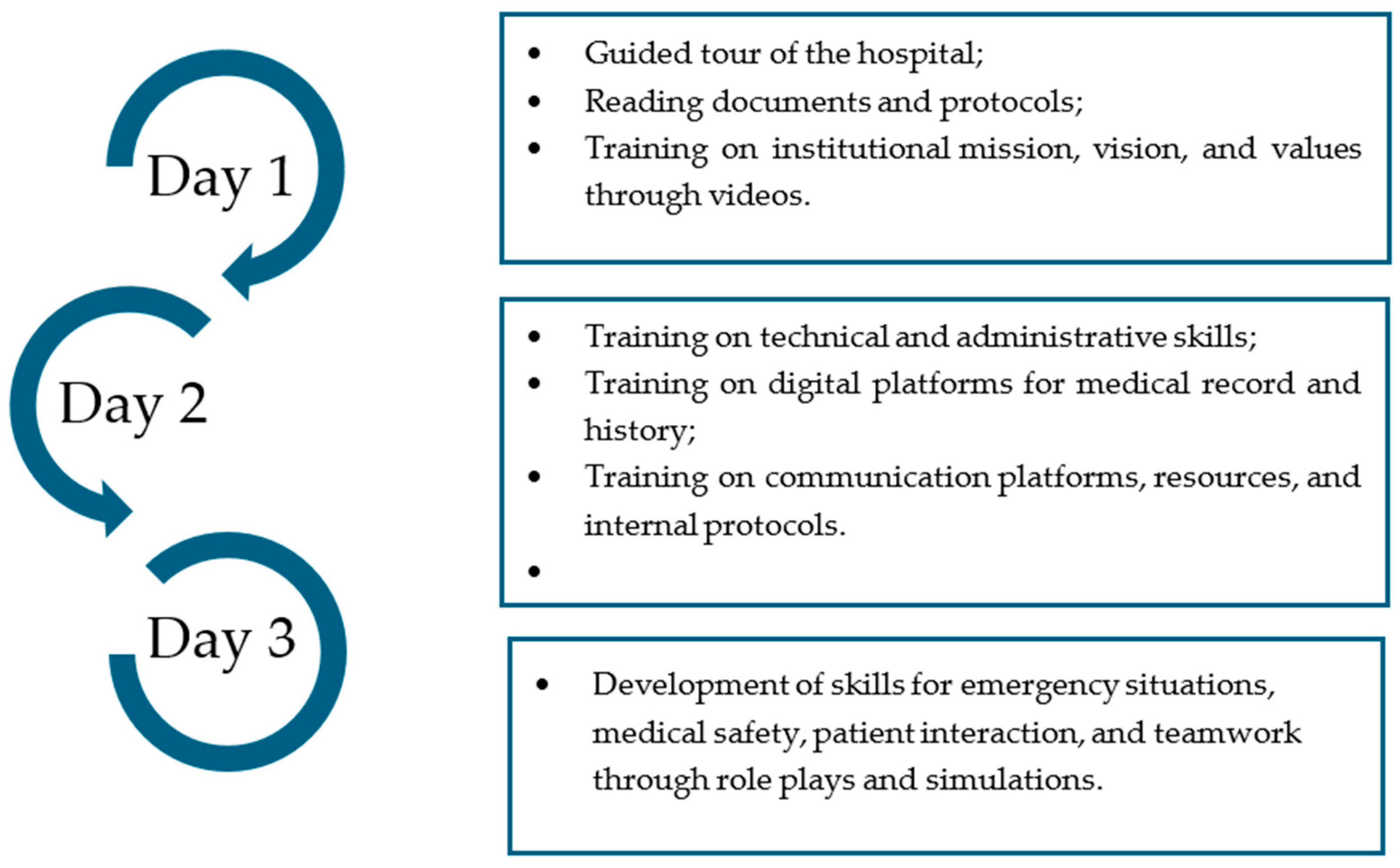 Over three consecutive days, the onboarding program focused on institutional orientation, developing administrative and technical skills according to the institution’s digital platforms, and clinical integration (see Figure 1).