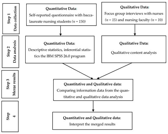 The quantitative phase data analysis was performed using IBM SPSS 26.0. Descriptive statistics, including means, standard deviations (SD), and proportions, were calculated to study the general characteristics of the participants. Sample normality was verified by calculating the sample mean and SD, and Pearson’s correlation coefficient was used to identify relationships among variables. Differences in measurement variables according to general characteristics were analyzed using t-tests, one-way ANOVA, and post hoc tests. The internal consistency of instruments was analyzed using Cronbach’s α, and factors influencing readiness for practice were examined using multiple regression analysis [2,8,10].
