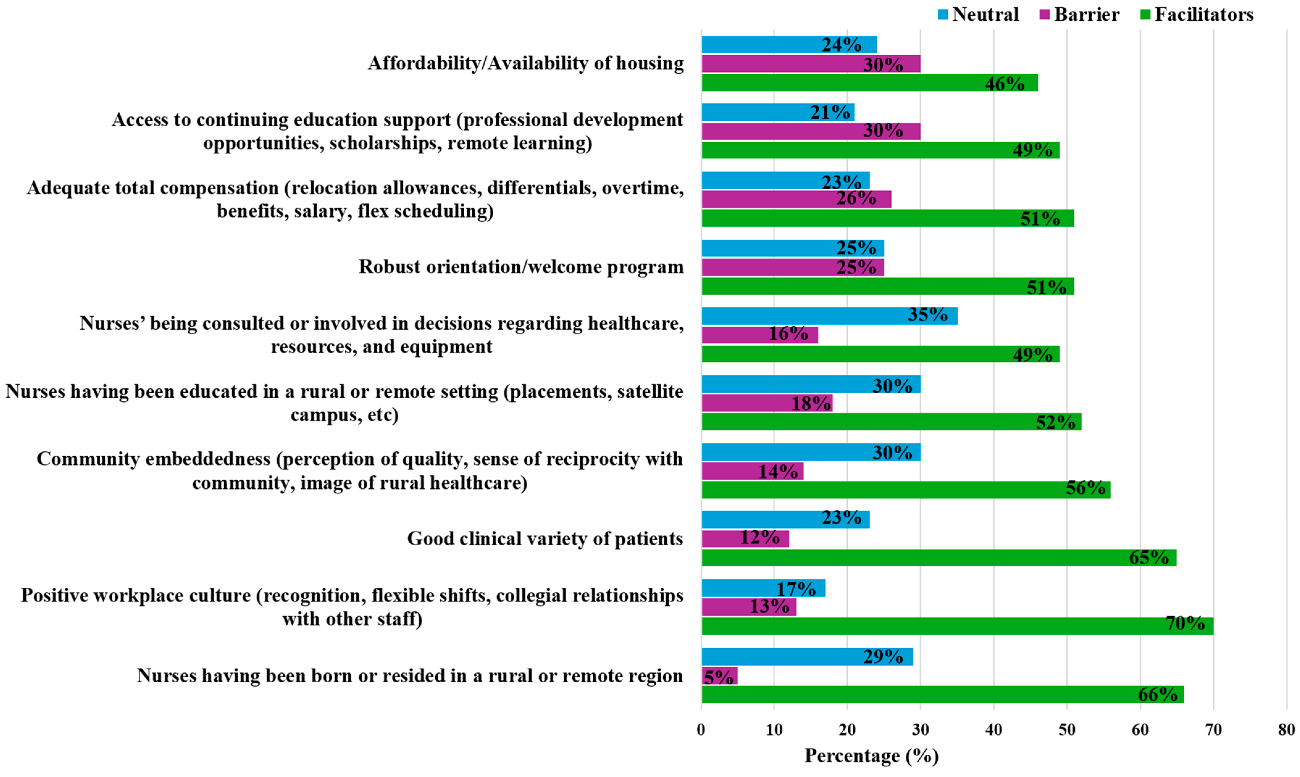 - Kulig, J.C.; Kilpatrick, K.; Moffitt, P.; Zimmer, L. Recruitment and Retention in Rural Nursing: It’s Still an Issue! Nurs. Leadersh. Tor. Ont. 2015, 28, 40–50. [Google Scholar] [PubMed]